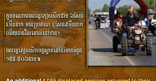 មានពលរដ្ឋភៀសសឹក៤.០៨៦នាក់បន្ថែមទៀត បានបន្តវិលទៅលំនៅឋានវិញ។ ក្នុងចំណោមពលរដ្ឋភៀសសឹកជាង៦សែន៤ម៉ឺននាក់ មានប្រមាណ៤សែន៩ម៉ឺននាក់ហើយបានវិលទៅលំនៅឋាន...
