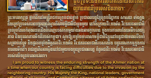 ខ្ញុំមានមោទនភាព ដែលបានឃើញនូវកម្លាំងដ៏រឹងមាំនៃមហាសាមគ្គីជាតិខ្មែរក្នុងកាលៈទេសៈដែលប្រទេសជាតិយើងកំពុងជួបប្រទះនឹងការលំបាកដោយសារការឈ្លានពានពីប្រទេសជិតខាង...