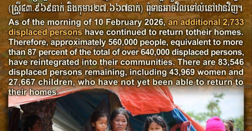 គិតត្រឹមព្រឹកថ្ងៃទី១០ ខែកុម្ភៈ ឆ្នាំ២០២៦ នៅមានពលរដ្ឋចំនួន៨៣.៥៤៦នាក់ទៀត (ស្រី្ត៤៣.៩៦៩នាក់ និងកុមារ២៧.៦៦៧នាក់) ពុំទាន់អាចវិលទៅលំនៅឋានវិញ។ As of t...