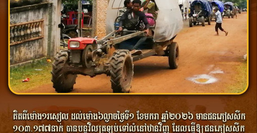 គិតពីម៉ោង១រសៀល ដល់ម៉ោង៦ល្ងាចថ្ងៃទី១ ខែមករា ឆ្នាំ២០២៦ មានជនភៀសសឹក១០៣.១៧៧នាក់ បានបន្តវិលត្រឡប់ទៅលំនៅឋានវិញ ដែលធ្វើឱ្យជនភៀសសឹកនៅសល់សរុប...