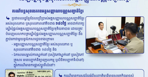 សូមបងប្អូនប្រជាពលរដ្ឋ ពិនិត្យសុពលភាពនៅក្នុងអត្តសញ្ញាណបណ្ណសញ្ជាតិខ្មែរ ករណីអស់សុពលភាព ឬសុពលភាពនៅតិចជាង១៨០ថ្ងៃ (៦ខែ) សូមអញ្ជើញទៅបំពេញបែបបទផ្តល់អត្តសញ្...