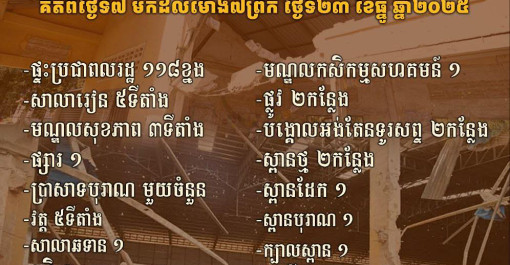 ករណីបំផ្លិចបំផ្លាញ ហេដ្ឋារចនាសម្ព័ន្ធរូបវន្តស៊ីវិល និងការខូចខាតជាអាទិ៍ ដោយសារអំពើឈ្លានពានរបស់ភាគីថៃ គិតពីថ្ងៃទី៧ មកដល់ម៉ោង៧ព្រឹក ថ្ងៃទី២៣ ខែធ្នូ ឆ្នាំ...