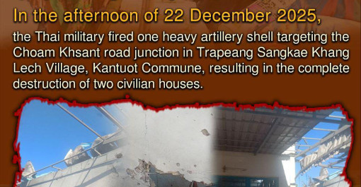 សៀលថ្ងៃទី២២ ខែធ្នូ ឆ្នាំ២០២៥ ទាហានថៃ បានប្រើប្រាស់កាំភ្លើងធុនធំបាញ់ផ្លោង១គ្រាប់ សំដៅចូលចំណុចផ្លូវបំបែកជាំក្សាន្ត ភូមិត្រពាំងសង្កែខាងលិច ឃុំកន្ទ...