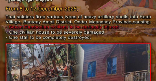 បើគិតចាប់ពីថ្ងៃទី៨ រហូតដល់ថ្ងៃទី១២ ខែធ្នូ ឆ្នាំ២០២៥ ទាហានថៃបានផ្លោងគ្រាប់ធំៗជាច្រើនប្រភេទ ចូលភូមិគាប ស្រុកបន្ទាយអំពិល ខេត្តឧត្តរមានជ័យ បណ្ដាលឱ្យ៖...