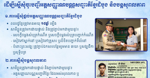 ដើម្បីស្នើសុំចុះបញ្ជីអត្តសញ្ញាណបណ្ណសញ្ជាតិខ្មែរថ្មី និងបន្តសុពលភាព តើមានលក្ខខណ្ឌ និងត្រូវភ្ជាប់ឯកសារអ្វីខ្លះ? ឆាណែលTelegram អគ្គនាយកដ្ឋានអត្តសញ...