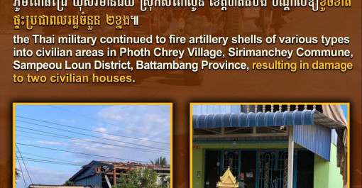 ចាប់ពីម៉ោង១រសៀល ដល់ម៉ោង៦ល្ងាច ថ្ងៃទី២៤ ខែធ្នូ ឆ្នាំ២០២៥ យោធាថៃ បានបន្តបាញ់ផ្លោងគ្រាប់គ្រប់ប្រភេទ ចូលតំបន់ស៊ីវិល ក្នុងភូមិសាស្ត្រ ភូមិពោធិ៍ជ្រៃ...