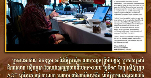 ប្រធានអាស៊ាន ឯកឧត្តម អាន់វ៉ាអុីប្រហ៊ីម នាយករដ្ឋមន្ត្រីម៉ាឡេស៊ី ប្រកាសប្រាប់ពិភពលោក ស្នើកម្ពុជា-ថៃឈប់បាញ់គ្នាចាប់ពីម៉ោង១០យប់ ថ្ងៃទី១៣ ខែធ្នូ ស្នើឱ្យក...