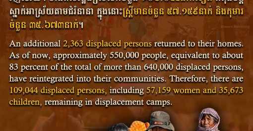 មានពលរដ្ឋភៀសសឹក២.៣៦៣នាក់បន្ថែមទៀត បានបន្តវិលត្រឡប់ទៅ លំនៅឋានវិញ។ ក្នុងចំណោមពលរដ្ឋភៀសសឹកសរុបជាង៦សែន៤ម៉ឺននាក់ មានប្រមាណ៥សែន៥ម៉ឺននាក់ ឬជាង៨៣% បានវិលត្រ...