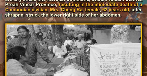 កាលពីព្រឹកថ្ងៃទី៨ ខែធ្នូ ឆ្នាំ២០២៥ ទាហានថៃ បានផ្លោងគ្រាប់ធំៗ ចូលឃុំមរកត ស្រុកជាំក្សាន្ត ខេត្តព្រះវិហារ បណ្ដាលឱ្យពលរដ្ឋស៊ីវិលខ្មែរ ឈ្មោះ ឆេង រ៉ា...