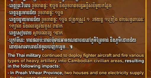 គិតចាប់ពីម៉ោង៦ល្ងាចថ្ងៃទី២៥ ដល់ម៉ោង៦ល្ងាច ថ្ងៃទី២៦ ខែធ្នូ ឆ្នាំ២០២៥ ទាហានថៃ បានបន្តប្រើយន្តហោះចម្បាំង និងផ្លោងគ្រាប់ធុនធ្ងន់គ្រប់ប្រភេទ ចូលតំបន...