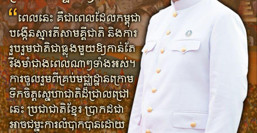 "...សម្តេចធិបតី បានមានប្រសាសន៍ច្បាស់ៗហើយថា ពេលនេះ គឺជាពេលដែលកម្ពុជាបង្កើនស្មារតីសាមគ្គីជាតិ និងការរួបរួមជាតិជាធ្លុងមួយឱ្យកាន់តែរឹងមាំជាងពេលណាៗទាំងអស់។...