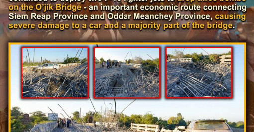 យប់ថ្ងៃទី១៩ ខែធ្នូ ឆ្នាំ២០២៥ ទាហានថៃ បានបន្តប្រើយន្តហោះចម្បាំង F16 ចំនួន ២គ្រឿង បើកការវាយប្រហារដោយទម្លាក់គ្រាប់បែកចំនួន៣គ្រាប់ លើស្ពានអូរជីក ដែ...
